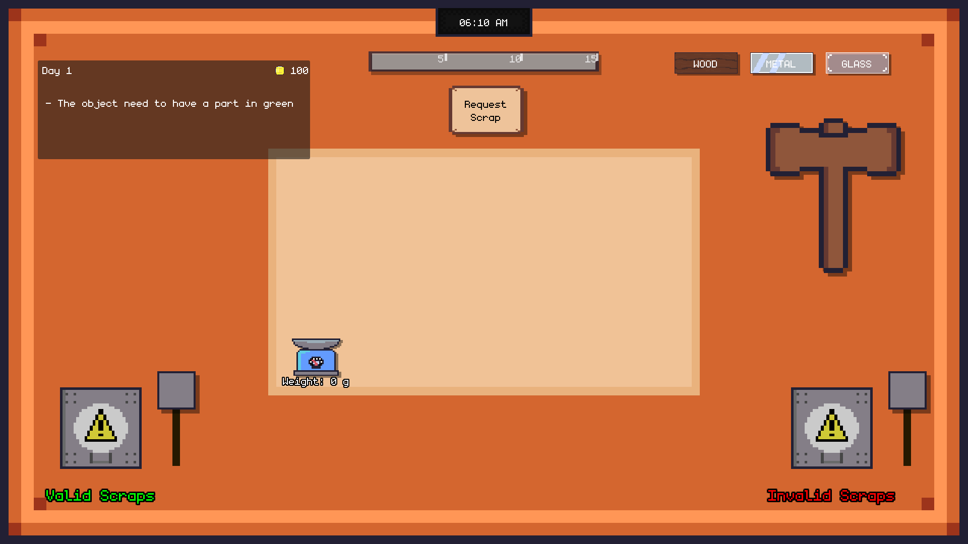 Hammer - Right-click to hit scraps. Listen carefully to recognize the materials they are made of.